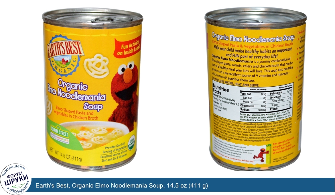 [DESCRIPT]Fun Activity on Inside Label! . Elmo Shaped Pasta and Vegetables in Chicken Broth. 123 Sesame Street. Healthy Habits for Life. Provides One Full Serving of Vegetables. Excellent Source of Iron, Zinc and Six B Vitamins. USDA Organic. Help your child make healthy habits an important and fun part of everyday life! . Elmo-shaped pasta, carrots, celery and chicken broth that can be part of a healthy meal your kids will love. This soup also contains protein and is an excellent source of 9 vitamins and minerals—which means it's good for them too. Check Out the Earth's Best Difference. Organic Ingredients grown in soil without potentially harmful pesticides. No artificial flavors, colors or preservatives. No Genetically Engineered Ingredients. Iron to help transport oxygen throughout your body. Zinc to boost your body's ability to fight infection. B Vitamins to unlock energy in carbohydrates.[/DESCRIPT]... (описание дополняется)
