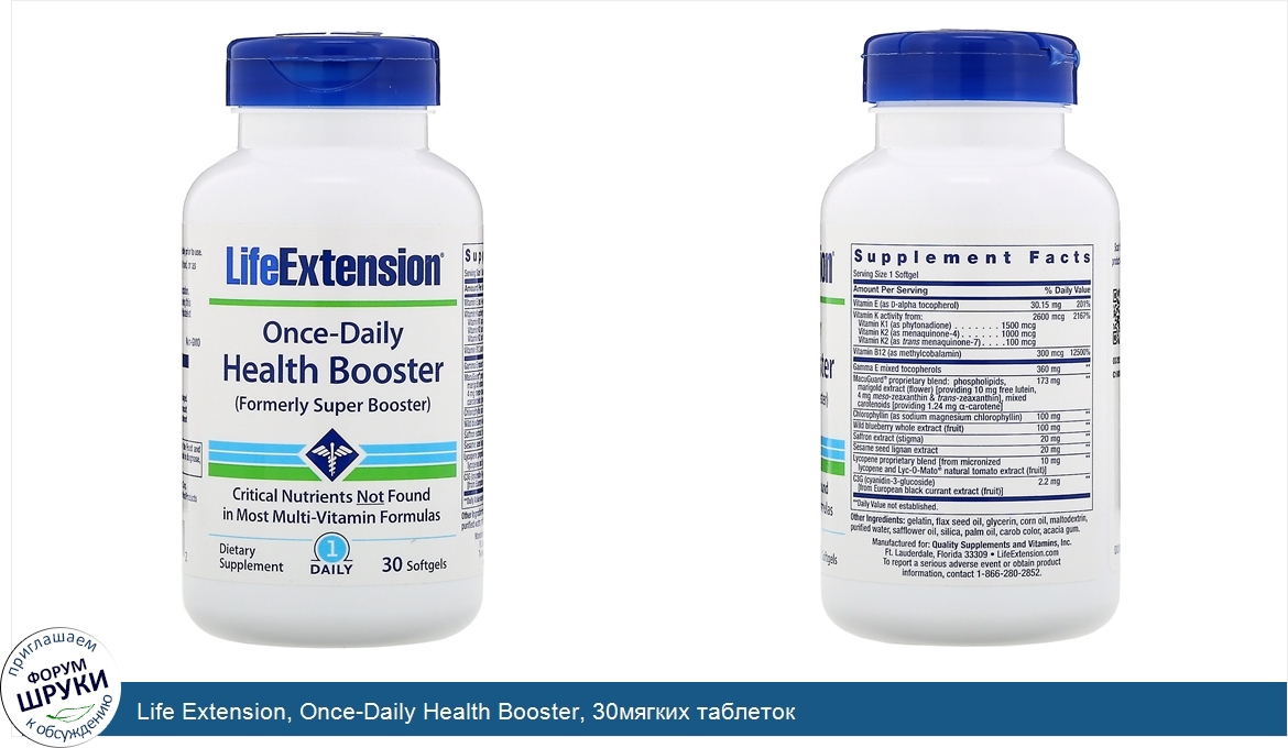 [DESCRIPT](Formerly Super Booster). Critical Nutrients Not Found in Most Multi-Vitamin Formulas. Dietary Supplement. 1 Daily. Non-GMO. Most people don’t get enough oil-based nutrients from their diet. So, we formulated our Once-Daily Health Booster to deliver high potencies of essential fat-soluble nutrients including vitamin K1 and several hard-to-find forms of vitamin K2, multiple forms of vitamin E, our MacuGuard® blend of valuable carotenoids for healthy vision, plus lycopene, saffron and more. Once-Daily Health Booster is a cost-effective way to get a variety of valuable, fat-soluble nutrients in one softgel. Once-Daily Health Booster Benefits. Fills dietary gaps with hard-to-obtain oil-based vitamins nutrients. Helps defend against oxidative stress with vitamin E. Supports bone and arterial health with vitamin K. Promotes vision health with MacuGuard® phospholipid blend. Heart and Bone-Friendly Vitamin K. Vitamin K is beneficial to cardiovascular and bone health, but it’s hard to get optimal amounts from diet alone. That’s why our formula includes not only vitamin K1, but also four potent forms of vitamin K2 for comprehensive vitamin K support. Utilizing MK-4, MK-6, MK-7 and MK-9, our formula supports bone and heart health by helping maintain a healthy calcium balance in your bones and arteries. Mixed Tocotrienols. Life Extension’s Once-Daily Health Booster contains tocotrienols, a form of vitamin E that provides potent benefits throughout the body. Tocotrienols can boost defenses against oxidative stress, promote a healthy lipid profile, protect the brain and cognition and support healthy hair growth. Five kinds of vitamin K. Vitamin K1. is the most common form of vitamin K, but it is tightly bound to plant cells in leafy green vegetables. Not only do many people not enjoy these vegetables, but vitamin K from these sources may be poorly absorbed. Our formula contains 2,000 mcg of vitamin K1, the same dosage found to encourage heart health in a randomized, placebo-controlled trial. Vitamin K2. comes in multiple forms, including MK-4, -6, -7 and -9. Although K2 is present in smaller amounts in the diet, it is better absorbed and stays in the bloodstream longer than K1 and has valuable heart and bone health benefits. Menaquinone-4 (MK-4). promotes arterial and bone health. This supplement delivers 1,500 mcg, the same dosage shown to promote healthy bone density in a clinical study. Trans. -menaquinone-7 (MK-7). helps maintain bone strength and arterial flexibility. This supplement delivers 181 mcg, the same dosage studied in double-blind, placebo-controlled trials measuring bone and cardiovascular health. MK-7 is well-absorbed and remains in the bloodstream over a sustained period of time. Once-Daily Health Booster provides a potent dose of a pure, ultra-absorbable form of MK-7, made with a bio-fermentation process. Menaquinone-9 (MK-9). promotes cardiovascular health, according to an eight-year epidemiological study in more than 16,000 women. This supplement provides 11 mcg of MK-6 and 43 mcg of MK-9, because these new rock stars of the vitamin K2 world are effective in very small amounts. Innovative Phytonutrients. Lycopene. —Lycopene helps maintain cardiovascular health by supporting vascular endothelial function (the inner lining of your arterial blood vessels). Lycopene also promotes a healthy inflammatory response and helps maintain already-healthy blood pressure levels. Lycopene famously supports prostate health, helping to regulate normal cellular proliferation. Lycopene has also been shown to help support a healthy insulin response and promote longevity. Chlorophyllin. —Chlorophyllin, derived from the green plant pigment chlorophyll, has been shown to have DNA-protective properties. MacuGuard® Carotenoid Phospholipid Blend. MacuGuard® is our innovative ocular-health formula based on a blend of lutein, trans-zeaxanthin and meso-zeaxanthin—important nutrients that protect the delicate photoreceptor cells in the retina's macula from light damage, promote eye health and support healthy vision. Lutein. is a carotenoid that is an important part of your macular pigment. It helps protect the eyes from the effects of blue and ultraviolet light. Lutein supports macular health and defends against oxidative stress to help keep your eyes functioning over time.Saffron helps maintain visual acuity. Odds are, your multivitamin formula missed a few of these nutrients. Fill in the gaps with Once-Daily Health Booster.[/DESCRIPT]... (описание дополняется)