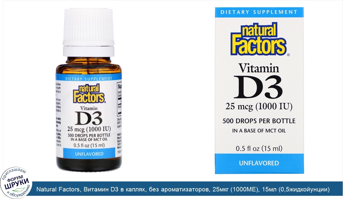 ru Natural Factors, Витамин D3 в каплях, без ароматизаторов, 25мкг (1000МЕ), 15мл (0,5жидкойунции)