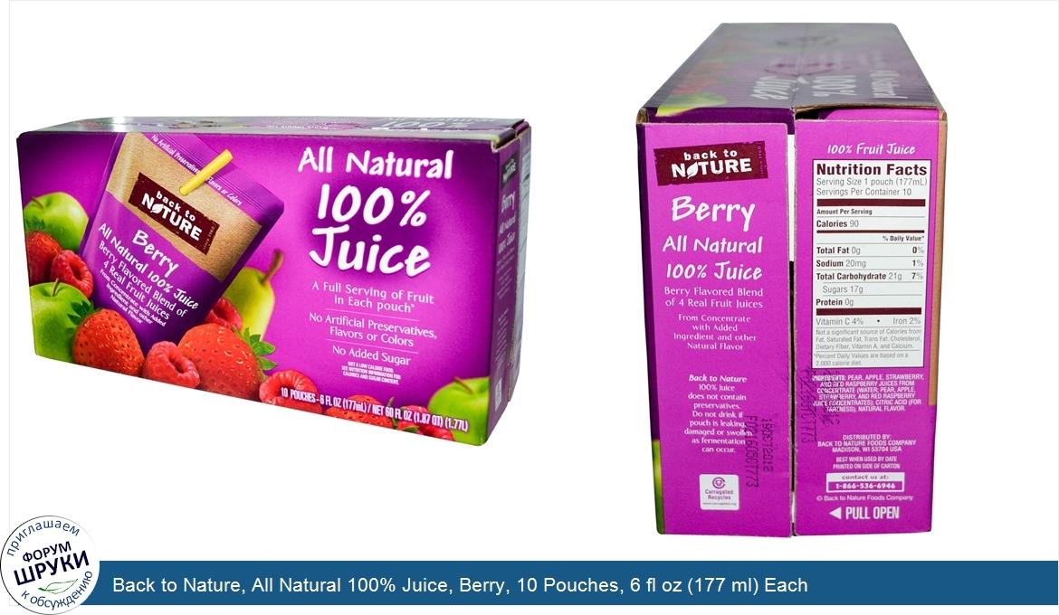 Друзья, если у вас есть отзыв/дополнение/комментарий/вопрос относительно Back to Nature, All Natural 100% Juice, Berry, 10 Pouches, 6 fl oz (177 ml) Each - напишите его ответом в эту тему (это будет полезно всему сообществу в целом и вам в отдельности).