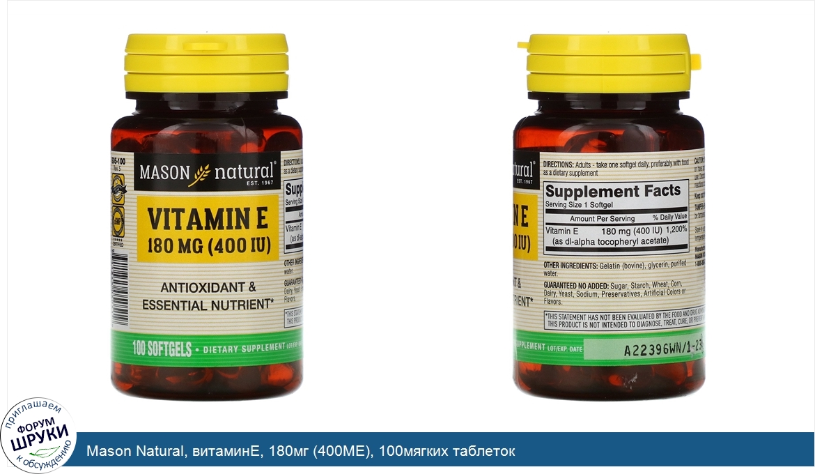 Друзья, если у вас есть отзыв/дополнение/комментарий/вопрос относительно Mason Natural, витаминE, 180мг (400МЕ), 100мягких таблеток - напишите его ответом в эту тему (это будет полезно всему сообществу в целом и вам в отдельности).
