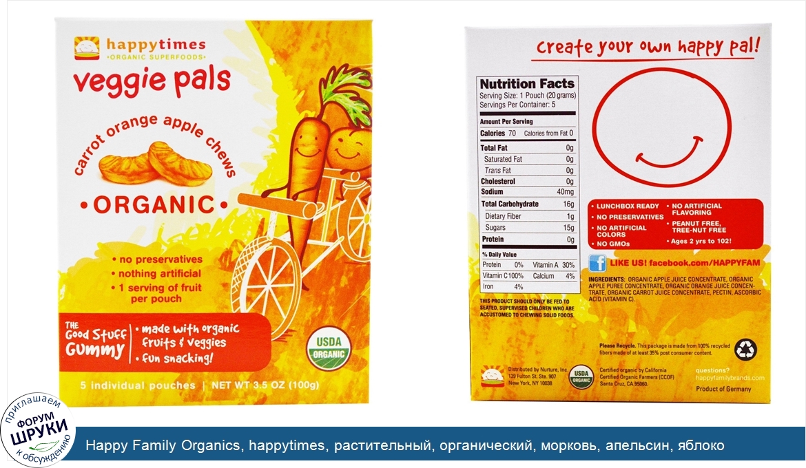 Happy Family Organics, happytimes, растительный, органический, морковь, апельсин, яблоко жевательные конфеты, 5 упаковок, 3,5 унции (100 г)