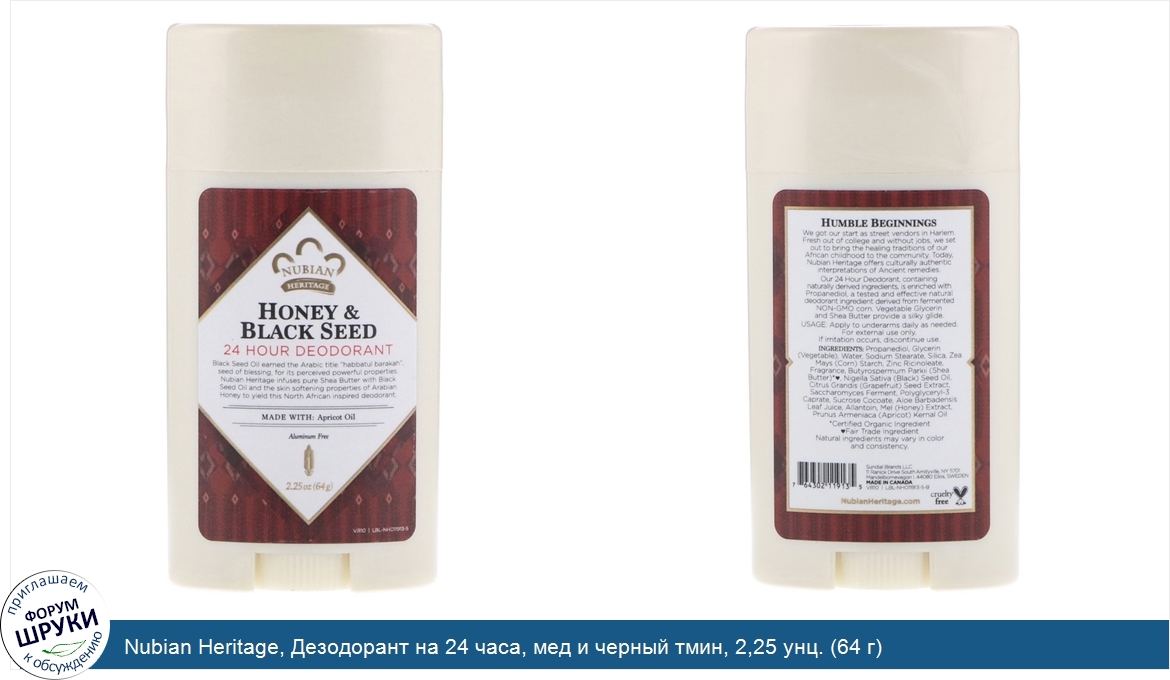 Nubian Heritage, Дезодорант на 24 часа, мед и черный тмин, 2,25 унц. (64 г)