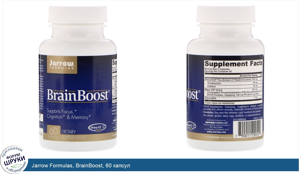 [DESCRIPT]Supports Focus, Cognition Memory. Dietary Supplement. Sharp-PS Gold. Jarrow Formulas BrainBoost combines clinically documented ingredients to deliver both short-term and long-term benefits. Sharp-PS Gold supplies the form of phosphatidylserine found naturally in the brain as a conjugated complex of DHA (omega-3) fatty acid as part of the triacylglycerol tail of the phosphatidylserine phospholipid. Phosphatidylserine is important for cell membrane fluidity and improves brain uptake of DHA. Chocamine Plus (extract of Theobroma cacao) is a patented extract high in theobromine that has been shown to positively affect cognitive and motor functions, including reaction time. Vinpocetine supports brain metabolism by increasing brain circulation, enhancing the cerebral synthesis of ATP, improving the utilization of oxygen and supporting the synthesis of several neurotransmitters that affect such critical brain functions as memory, recall, focus and mood.[/DESCRIPT]... (описание дополняется)