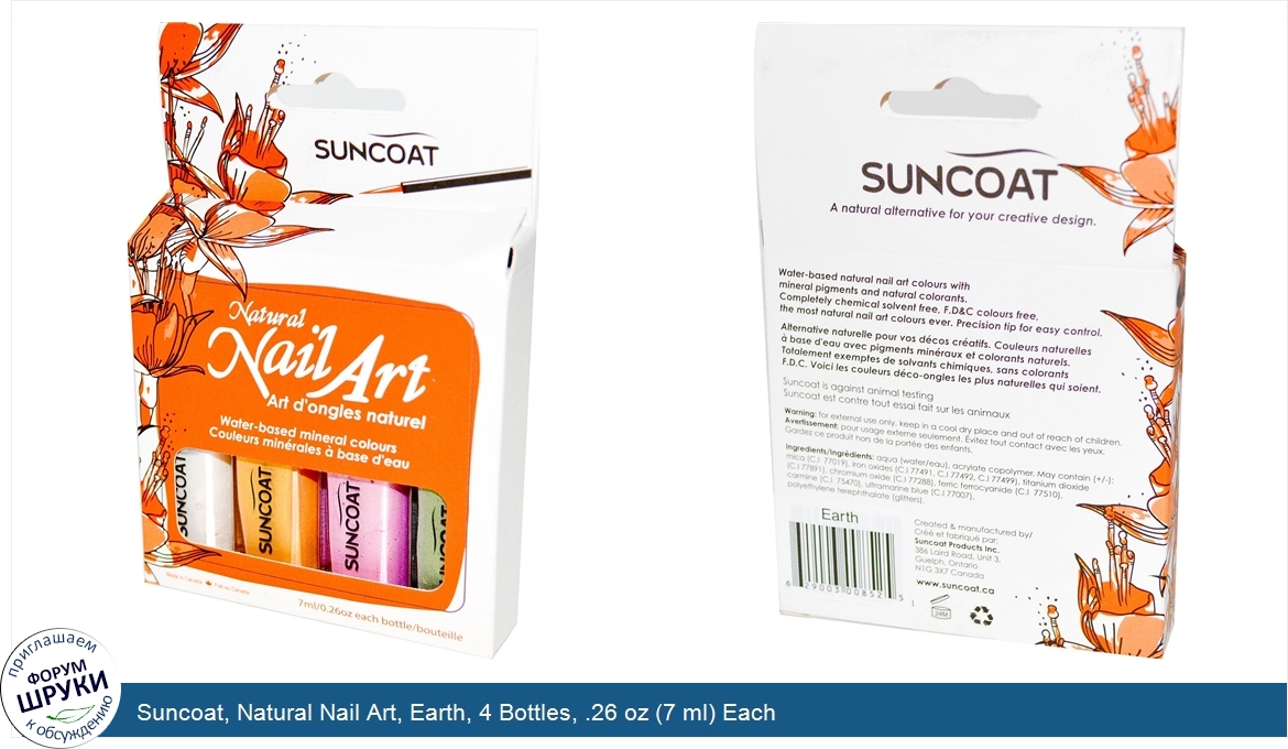 Друзья, если у вас есть отзыв/дополнение/комментарий/вопрос относительно Suncoat, Natural Nail Art, Earth, 4 Bottles, .26 oz (7 ml) Each - напишите его ответом в эту тему (это будет полезно всему сообществу в целом и вам в отдельности).
