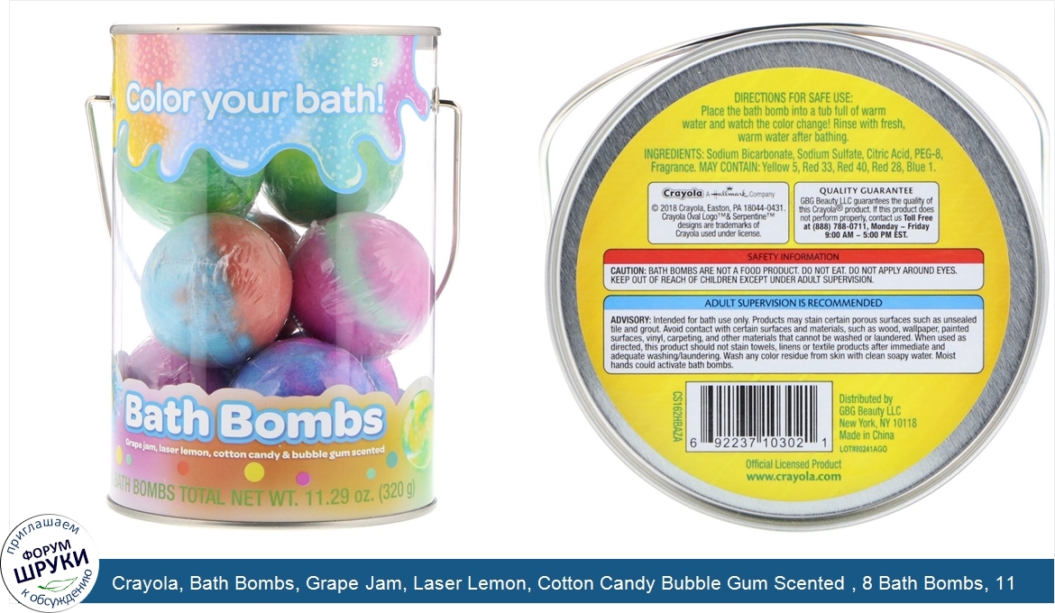 Друзья, если у вас есть отзыв/дополнение/комментарий/вопрос относительно Crayola, Bath Bombs, Grape Jam, Laser Lemon, Cotton Candy Bubble Gum Scented , 8 Bath Bombs, 11.29 oz (320 g) - напишите его ответом в эту тему (это будет полезно всему сообществу в целом и вам в отдельности).