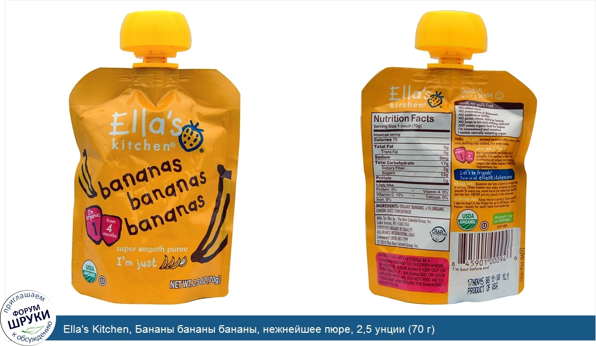 Друзья, если у вас есть отзыв/дополнение/комментарий/вопрос относительно Ella's Kitchen, Бананы бананы бананы, нежнейшее пюре, 2,5 унции (70 г) - напишите его ответом в эту тему (это будет полезно всему сообществу в целом и вам в отдельности).