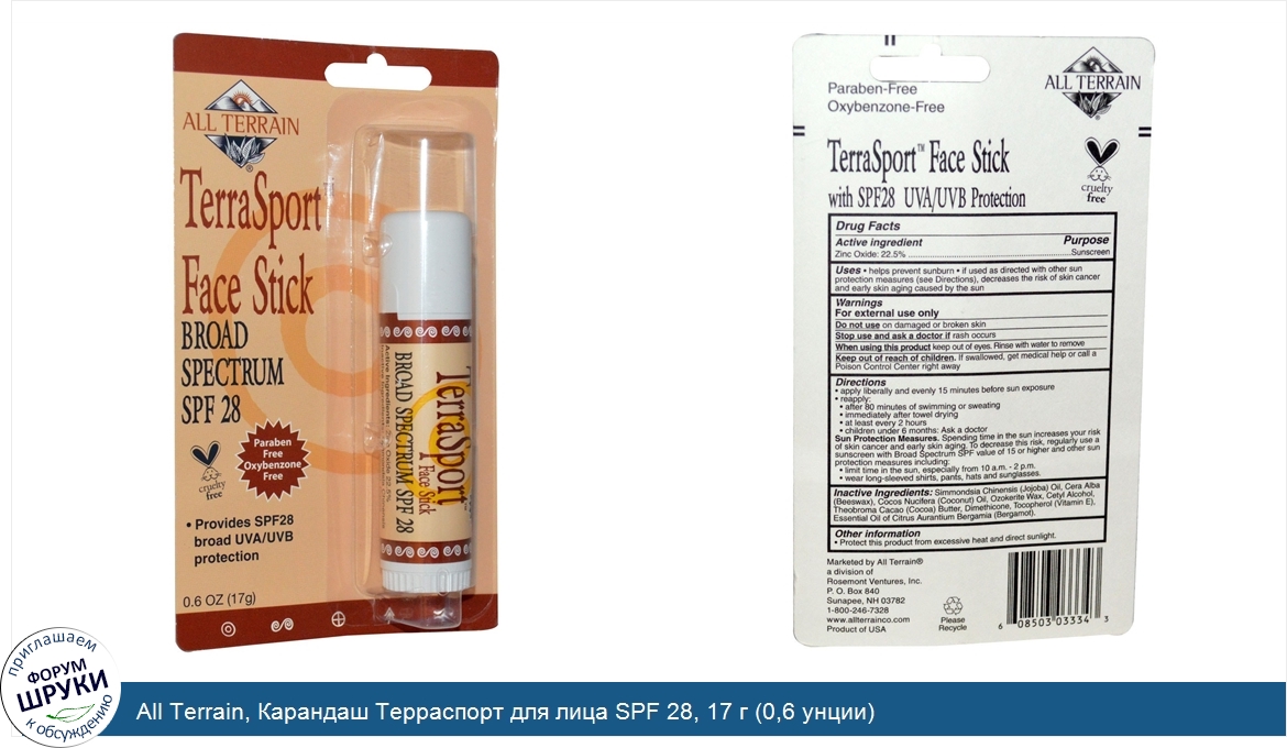 Друзья, если у вас есть отзыв/дополнение/комментарий/вопрос относительно All Terrain, Карандаш Терраспорт для лица SPF 28, 17 г (0,6 унции) - напишите его ответом в эту тему (это будет полезно всему сообществу в целом и вам в отдельности).