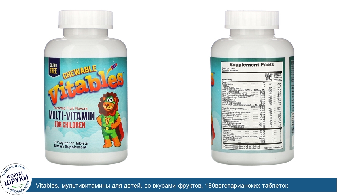 . Жевательные мультивитамины для детей. Vitables. Жевательные конфеты для настоящих супергероев! Необходимые мультивитамины. Фрукты и овощи. Ассорти фруктовых вкусов. 180 вегетарианских жевательных таблеток. Без ...
