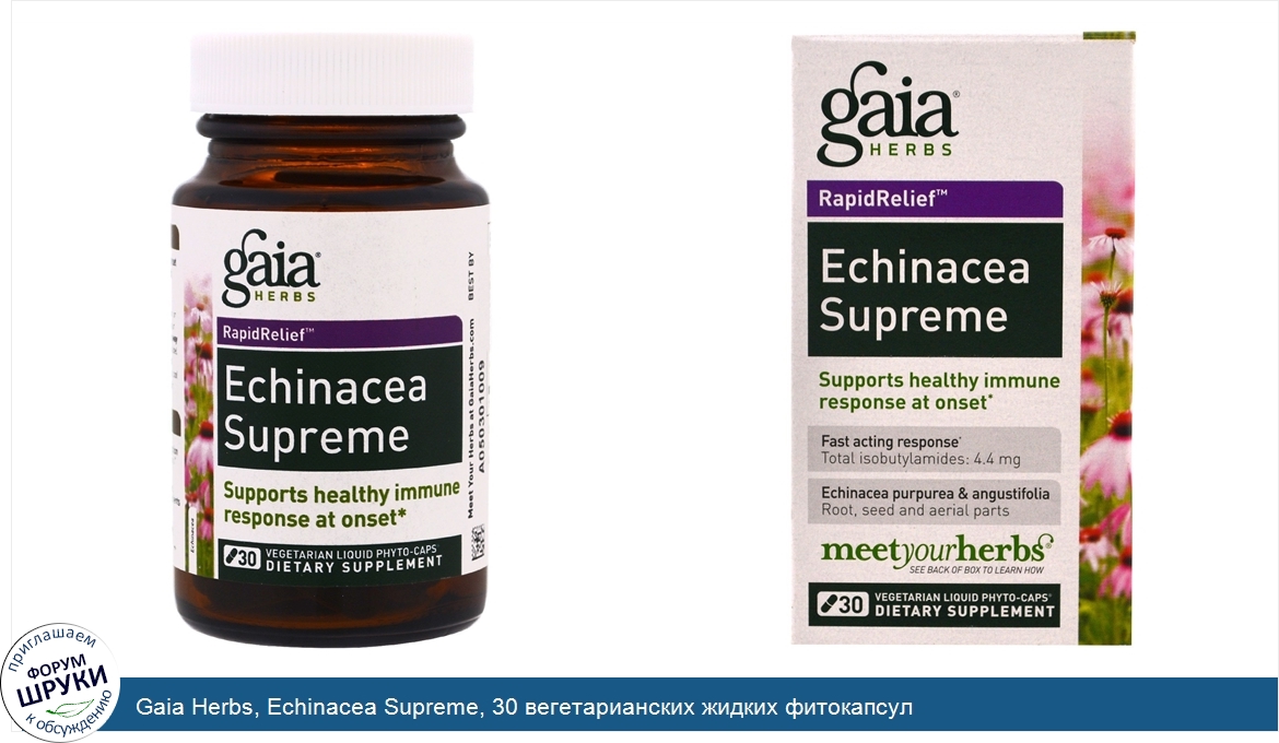 [DESCRIPT]Plant Intelligence. RapidRelief. Supports Healthy Immune Response at Onset. Fast Acting Response - Total Isobutylamides: 4.4 mg. Echinacea Purpurea Angustifolia - Root, Seed and Aerial Parts. Meet Your Herbs. Dietary Supplement. RapidRelief. You can maintain optimum health, when you give your body the right support. Gaia Herbs' RapidRelief products deliver results fast so you don't interrupt you active life. Echinacea Supreme. Echinacea has been used successfully for hundreds of years to support immune health. Gaia Herbs' Echinacea purpurea is grown on Gaia's own certified organic farm. Concentrated for fast-acting response, Echinacea Supreme contains the full spectrum of Echinacea phytochemicals --- including isobutylamides, the constituents most effective at supporting a healthy immune response. The Gaia Difference. Liquid potency, easy absorption. Alcohol-free Liquid Phyto-Caps U.S. Patent No. 6,238, 696 B1. 100% vegetarian, dairy free, no gluten-containing ingredients. Easily digestible plant-derived capsule.[/DESCRIPT]... (описание дополняется)