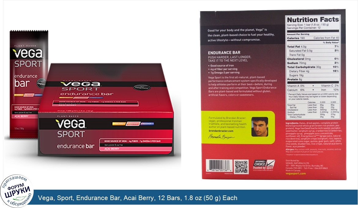 [DESCRIPT]Plant-Based. With EnergySource. Sustain. Good Source of Iron. 4 g Fiber. 1 g Omega-3 Per Bar. Gluten Free. Good for your body and the planet, Vega is the clean, plant-based choice to fuel your healthy, active lifestyle—without compromise. Push Harder, Last Longer, Take it to the Next Level. Good source of iron. 4 g of fiber per serving. 1 g Omega-3 per serving. Vega Sport is the first all-natural, plant-based performance enhancement system specifically developed to help athletes perform at their best—before, during and after training and competition. Formulated by Brendan Brazier: vegan, professional Ironman triathlete, and best-selling health author on plant-based nutrition.[/DESCRIPT]... (описание дополняется)