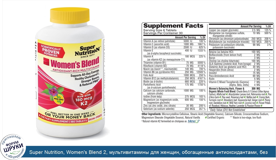 Друзья, если у вас есть отзыв/дополнение/комментарий/вопрос относительно Super Nutrition, Women's Blend 2, мультивитамины для женщин, обогащенные антиоксидантами, без железа - напишите его ответом в эту тему (это будет полезно всему сообществу в целом и вам в отдельности).