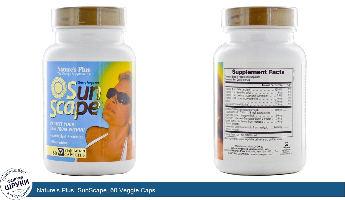 [DESCRIPT]The Energy Supplements. Dietary Supplement. Protect Your Skin From Within! . Antioxidant Protection. Moisturizing. Vcaps. Nutritional Support for Free-Radical Defense. Nature's Plus SunScape is the ultimate nutritional defense against the damaging rays of the sun! SunScrape helps your skin maintain a beautiful, healthy, vibrant glow all year round with a powerful array of protective antioxidant factors, proven to diminish free-radical damage and help retain skin's optimal moisture. SunScape's advanced, scientifically backed nutritional profile includes FloraGLO brand free lutein and GliSODin, the world's first orally effective form of superoxide dismutase (SOD), the body's master antioxidant defense enzyme. Protect your skin's beautiful glow from the inside out with the advanced antioxidant support of Nature's Plus SunScape![/DESCRIPT]... (описание дополняется)