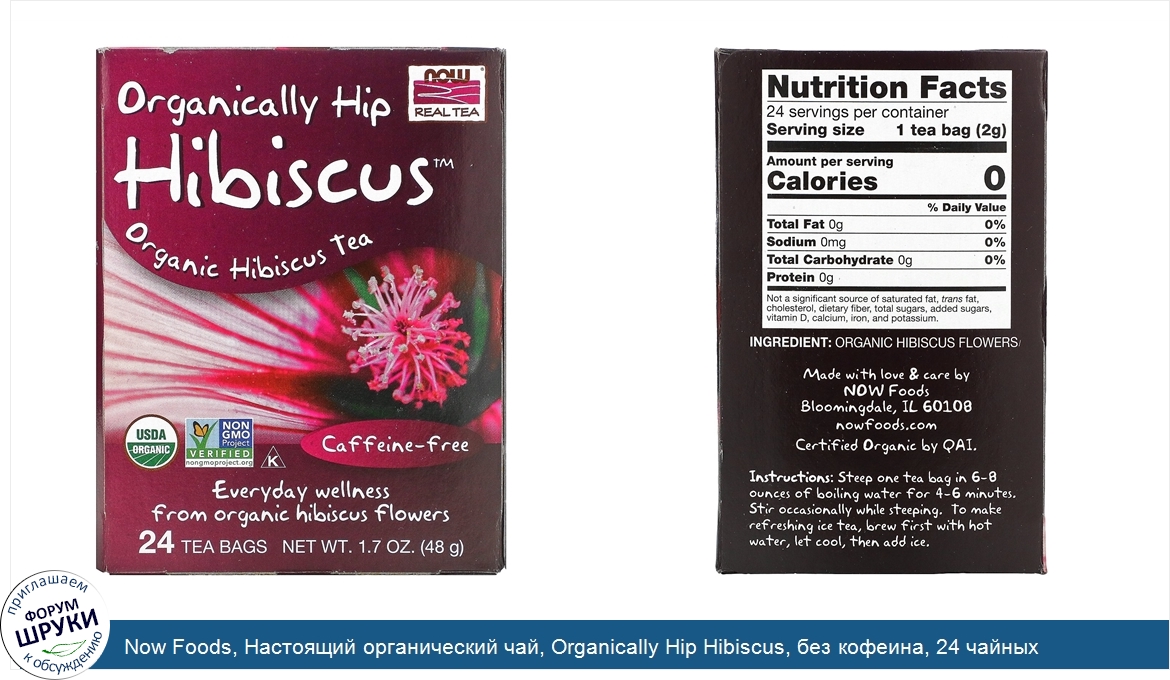 ru Now Foods, Настоящий органический чай, Organically Hip Hibiscus, без кофеина, 24 чайных пакетика, 48 г (1,7 унции)