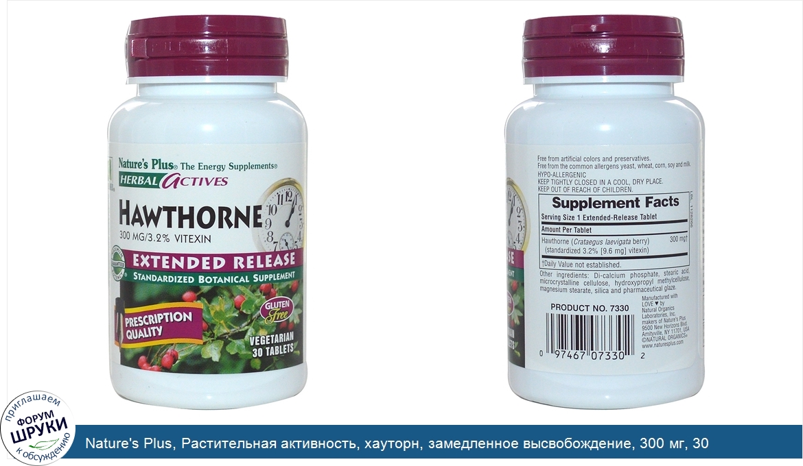 Друзья, если у вас есть отзыв/дополнение/комментарий/вопрос относительно Nature's Plus, Растительная активность, хауторн, замедленное высвобождение, 300 мг, 30 вегетарианских таблеток - напишите его ответом в эту тему (это будет полезно всему сообществу в целом и вам в отдельности).