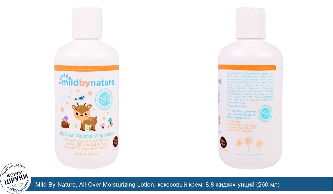 Друзья, если у вас есть отзыв/дополнение/комментарий/вопрос относительно Mild By Nature, All-Over Moisturizing Lotion, кокосовый крем, 8,8 жидких унций (260 мл) - напишите его ответом в эту тему (это будет полезно всему сообществу в целом и вам в отдельности).