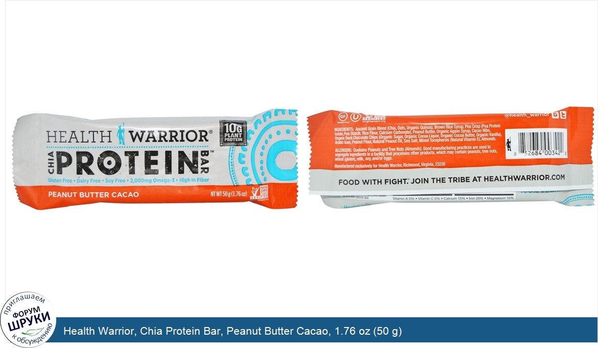 Друзья, если у вас есть отзыв/дополнение/комментарий/вопрос относительно Health Warrior, Chia Protein Bar, Peanut Butter Cacao, 1.76 oz (50 g) - напишите его ответом в эту тему (это будет полезно всему сообществу в целом и вам в отдельности).