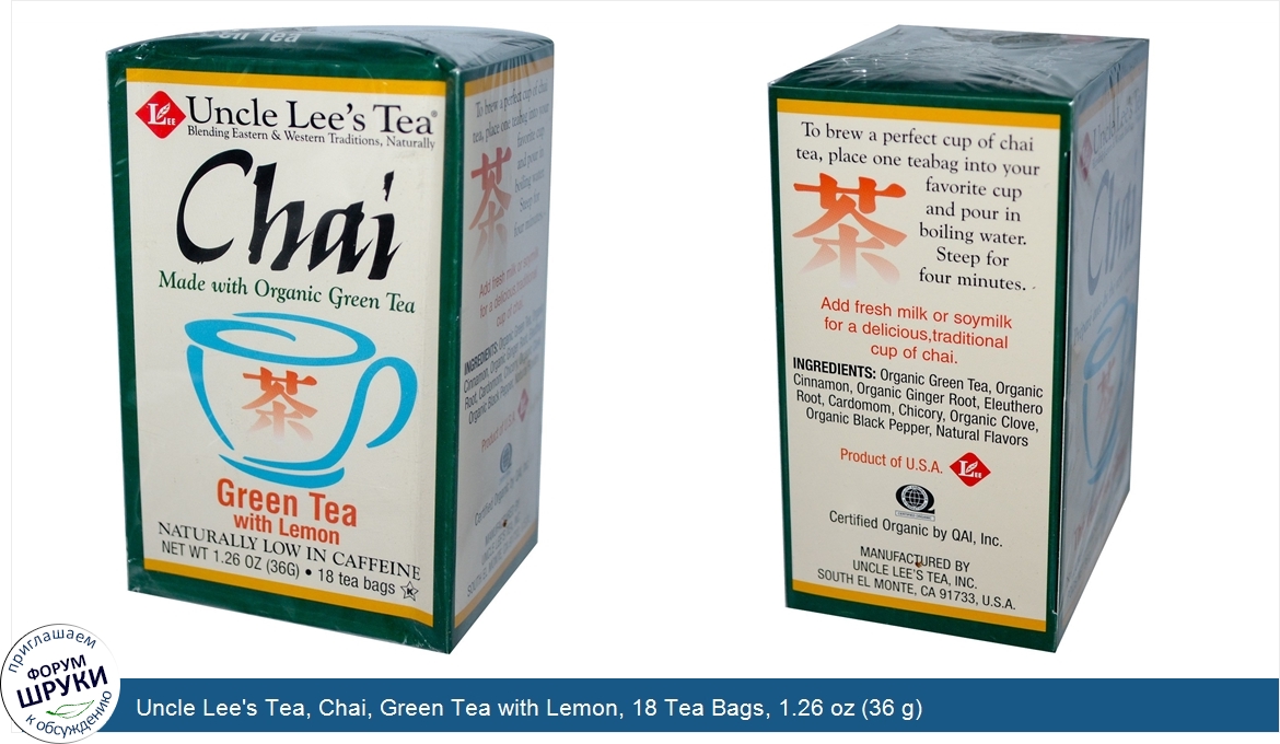 Uncle Lee's Tea, Chai, Green Tea with Lemon, 18 Tea Bags, 1.26 oz (36 g)