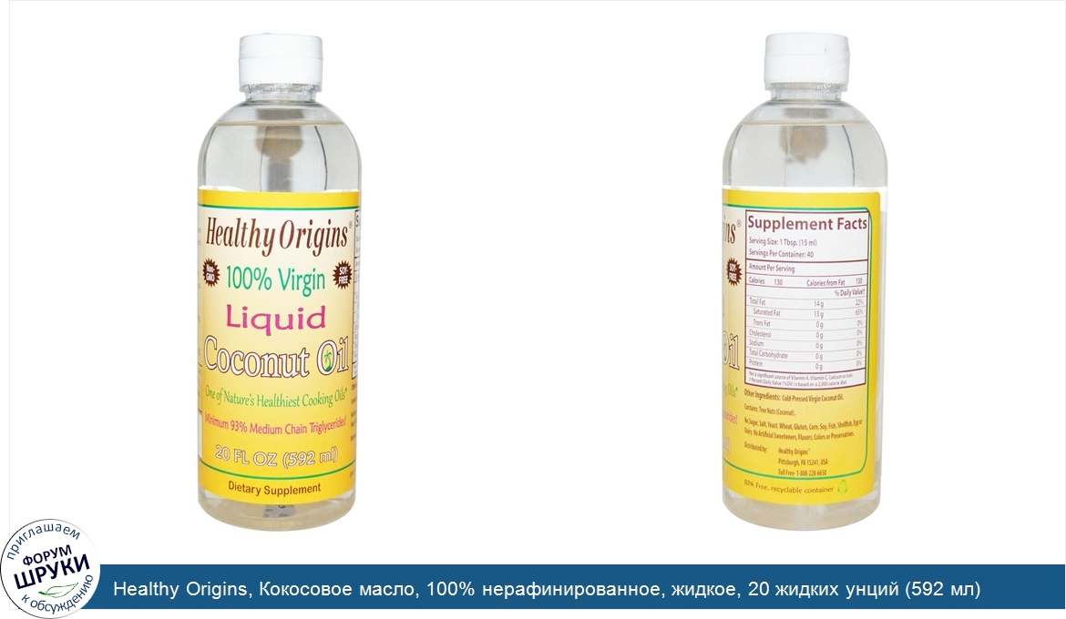 Друзья, если у вас есть отзыв/дополнение/комментарий/вопрос относительно Healthy Origins, Кокосовое масло, 100% нерафинированное, жидкое, 20 жидких унций (592 мл) - напишите его ответом в эту тему (это будет полезно всему сообществу в целом и вам в отдельности).