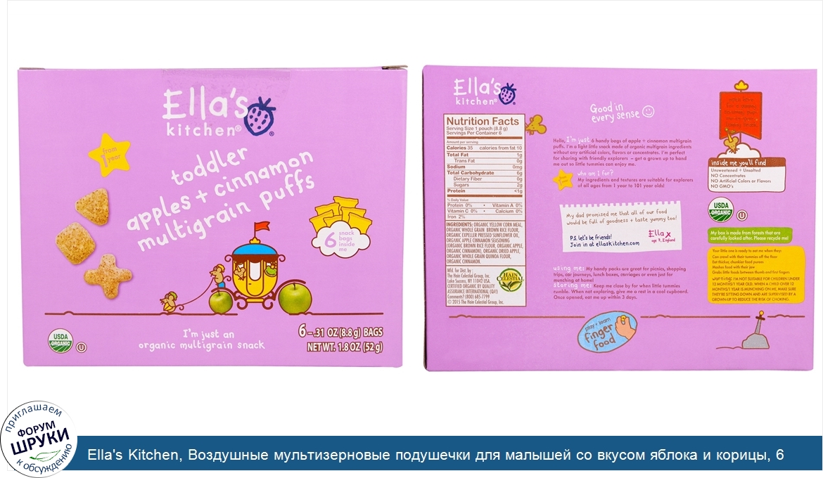 Друзья, если у вас есть отзыв/дополнение/комментарий/вопрос относительно Ella's Kitchen, Воздушные мультизерновые подушечки для малышей со вкусом яблока и корицы, 6 пакетиков по 0,31 унции (8,8 г) - напишите его ответом в эту тему (это будет полезно всему сообществу в целом и вам в отдельности).