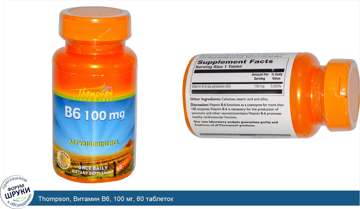 Друзья, если у вас есть отзыв/дополнение/комментарий/вопрос относительно Thompson, Витамин B6, 100 мг, 60 таблеток - напишите его ответом в эту тему (это будет полезно всему сообществу в целом и вам в отдельности).