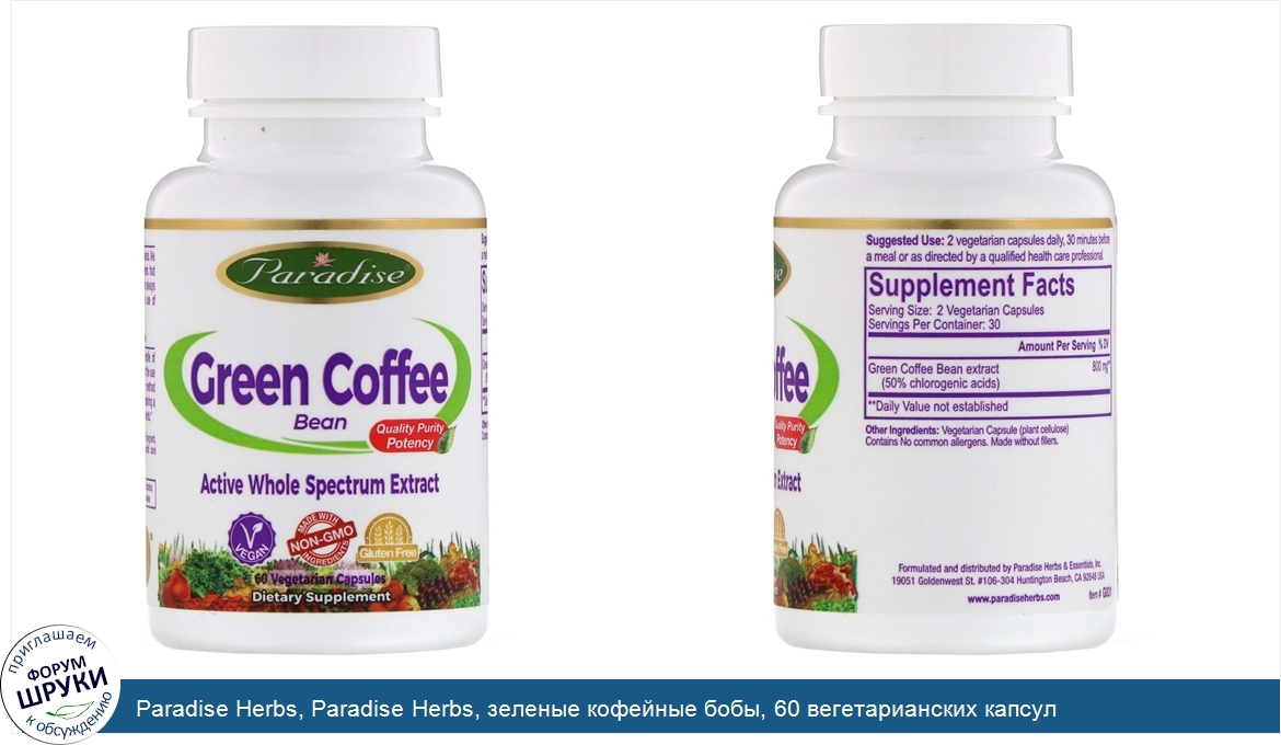 Друзья, если у вас есть отзыв/дополнение/комментарий/вопрос относительно Paradise Herbs, Paradise Herbs, зеленые кофейные бобы, 60 вегетарианских капсул - напишите его ответом в эту тему (это будет полезно всему сообществу в целом и вам в отдельности).