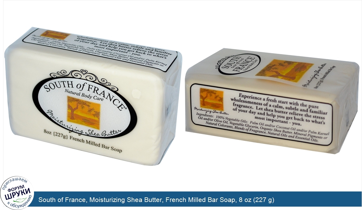 Друзья, если у вас есть отзыв/дополнение/комментарий/вопрос относительно South of France, Moisturizing Shea Butter, French Milled Bar Soap, 8 oz (227 g) - напишите его ответом в эту тему (это будет полезно всему сообществу в целом и вам в отдельности).