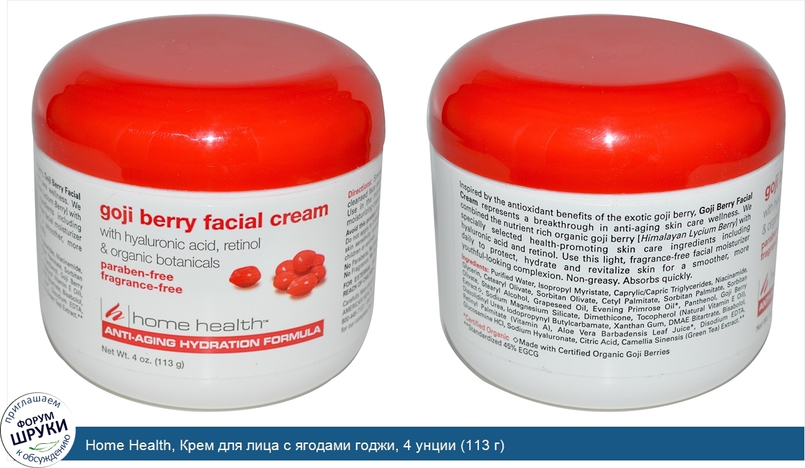 Друзья, если у вас есть отзыв/дополнение/комментарий/вопрос относительно Home Health, Крем для лица с ягодами годжи, 4 унции (113 г) - напишите его ответом в эту тему (это будет полезно всему сообществу в целом и вам в отдельности).