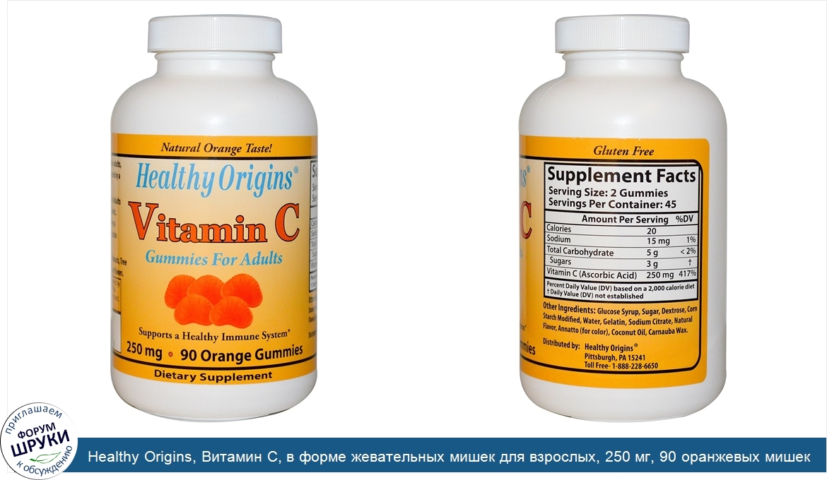Натуральный вкус апельсина! . Поддерживает иммунную систему. Пищевая добавка. Без глютена. Без сои. Витамин С от Healthy Origins в форме жевательных мишек для взрослых — это прекрасная альтернатива витамину С в т...