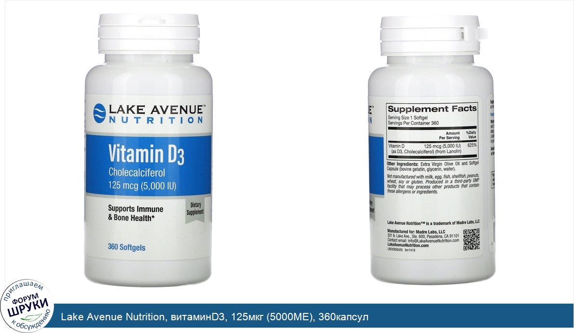 Друзья, если у вас есть отзыв/дополнение/комментарий/вопрос относительно Lake Avenue Nutrition, витаминD3, 125мкг (5000МЕ), 360капсул - напишите его ответом в эту тему (это будет полезно всему сообществу в целом и вам в отдельности).