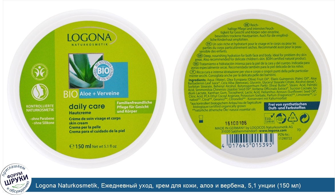 Друзья, если у вас есть отзыв/дополнение/комментарий/вопрос относительно Logona Naturkosmetik, Ежедневный уход, крем для кожи, алоэ и вербена, 5,1 унции (150 мл) - напишите его ответом в эту тему (это будет полезно всему сообществу в целом и вам в отдельности).