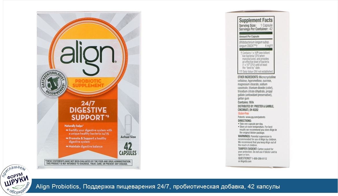 [DESCRIPT]#1 Gastroenterologist Recommended. ‡. Probiotic Supplement. Gluten-Free. Rooted in Nature. Backed by Science. Naturally Helps:. Fortify your digestive system with a unique healthy bacteria 24/7. §. Promote Support a healthy digestive system. Maintain digestive balance. Why Use Align? . Developed by Gastroenterologists. Only Align fortifies the digestive system 24/7 with unique Bifidobacterium 35624. §. Common issues such as diet, changes in routine, travel, and stress may disrupt your natural balance of good bacteria. Diet. Changes in Routine. Travel. Stress. Compare Align Digestive Support to Other Probiotic Supplements. Align . Others . Contains the unique, patented, pure-strain Bifidobacterium 35624. Yes . No . #1 Gastroenterologist recommended probiotic brand. ‡. Yes . No . Align Probiotic is the product of over 10 years of scientific research and contains the unique, pure-strain probiotic Bifidobacterium 35624. Align is a great way to help support your digestive balance. Align has been the #1 recommended probiotic brand by Gastroenterologists (Doctors who are experts in digestive health) for over 10 years in a row. §With continued use. ‡Among gastroenterologists who recommend a brand of probiotic in AlphaImpactRx 2008-2017 surveys.[/DESCRIPT]... (описание дополняется)
