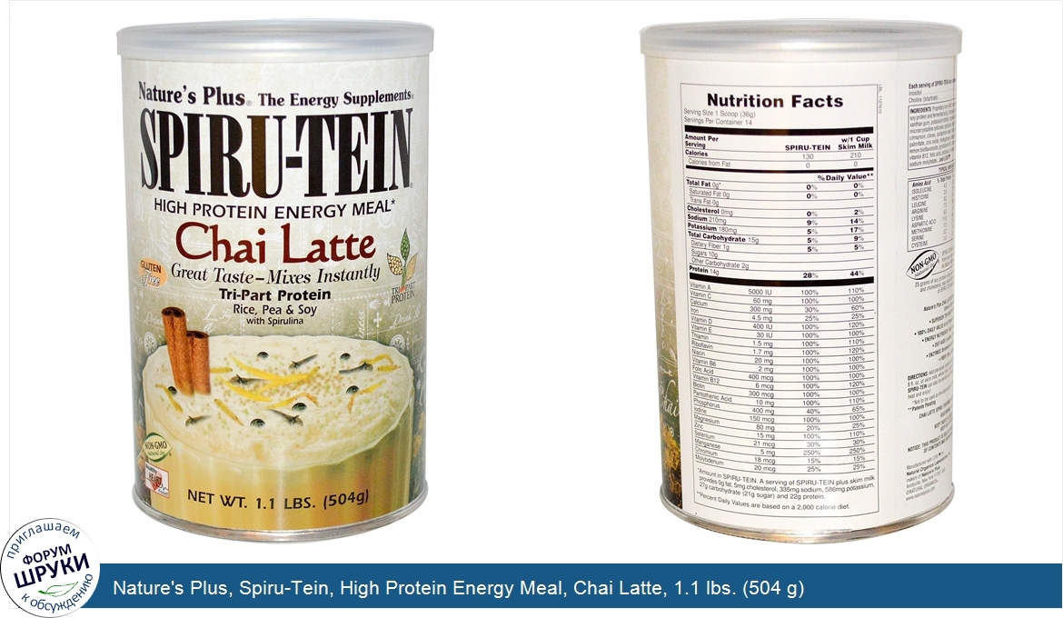 [DESCRIPT]Quality Guaranteed by Independent Laboratory Assays. The Energy Supplements. High Protein Energy Meal*. Gluten Free. Great Taste - Mixes Instantly. Tri-Part Protein. Rice, Pea Soy with Spirulina. Non-GMO Natural Soy. Healthy Heart Food. Vegetarian, Yeast-Free Product. Spiru-Tein is scientifically formulated with isolated soy protein from only non-genetically modified (non-GMO) soybeans — As Nature Intended. 25 grams of soy protein a day, as part of a diet low in saturated fat and cholesterol, may reduce the risk of heart disease. A serving of Spiru-Tein supplies 6.25 grams of soy protein. Nature's Plus Chai Latte Spiru-Tein Powder features a unique blend of ingredients, including. Superior Tri-Part Protein Blend: ** Rice, Pea, Soy. 100% Daily Value of all Vitamins. Broad Profile of Essential Minerals. Energy Nutrients: High Quality Tri-Part Protein and Bee Pollen. Diet-Aids: Lecithin, Spirulina, Choline and Inositol. Enzymes: Bromelain and Papaya. Cleansing: Chlorophyll. Fiber: Bran, Cellulose and Apple Pectin. *Not to be used as the sole source of dietary calories.[/DESCRIPT]... (описание дополняется)