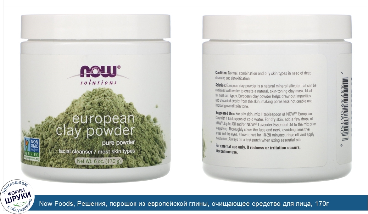 Now Foods, Решения, порошок из европейской глины, очищающее средство для лица, 170г