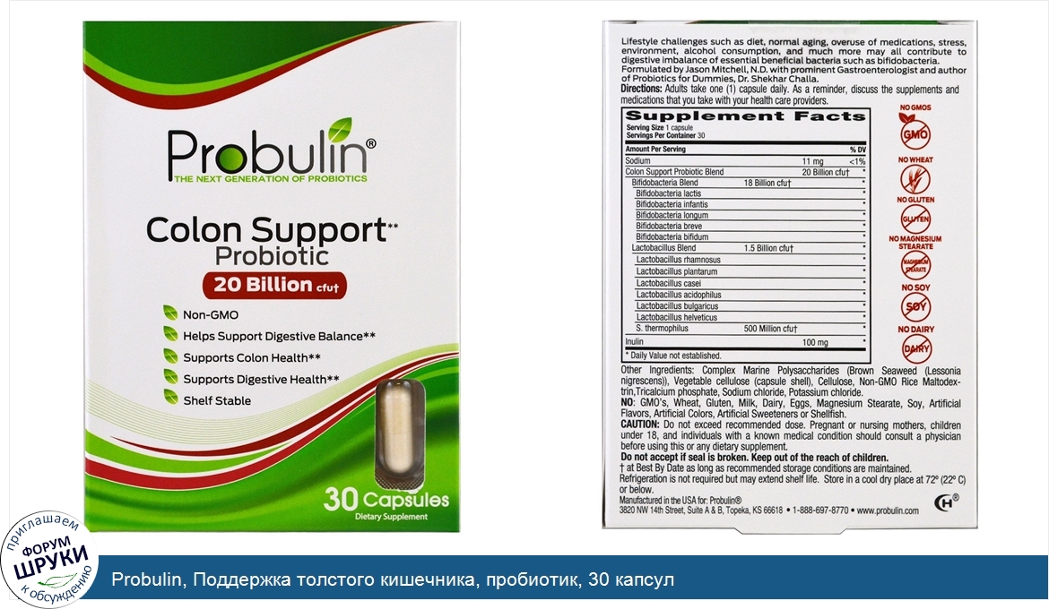 [DESCRIPT]Пробиотики нового поколения. 20 млрд КОЕ†. Не содержит ГМО. Способствует поддержанию пищеварительного баланса. Поддержка здоровья толстой кишки. Способствует здоровью пищеварительной системы. Длительное хранение. Пищевая добавка. Не содержит ГМО. Не содержит пшеницы. Не содержит глютена. Не содержит стеарата магния. Не содержит сои. Не содержит молочных продуктов. Средство для поддержки здоровья толстой кишки Probulin представляет собой целевой пробиотик, принимаемый один раз в день, а также пребиотик, содержащийся в высокой концентрацией в полезных бифидобактериях:. Описание. Благоприятное действие:. 20 млрд КОЕ† на капсулу. Поддержка здоровья толстой кишки. 12 важнейших пробиотических штаммов. Способствует здоровью пищеварительной системы. Продукт длительного хранения. Поддержка пищеварительного баланса. Пребиотический инулин — пища для выживания пробиотиков. Задействует систему объемной доставки пребиотиков MAKTrek™. Проблемы, связанные с образом жизни, такие как диета, нормальное старение, чрезмерное употребление лекарственных средств, стресс, воздействие окружающей среды, потребление алкоголя и многое другое, могут способствовать развитию пищеварительного дисбаланса незаменимых полезных бактерий, таких как бифидобактерии. Разработано доктором Джейсоном Митчеллом (Jason Mitchell), известным гастроэнтерологом и автором книги «Пробиотики для начинающих», а также доктором Шехаром Чалла (Shekhar Challa). Все продукты серии Probulin включают в себя объемную систему доставки MAKTrek, патентная заявка на которую находится на рассмотрении. Эта улучшенная система способствует выживанию полезных пробиотических бактерий, обеспечивая двухуровневую кислотную защиту, буферизацию при транспортировке и дополнительные механизмы защиты.[/DESCRIPT]... (описание дополняется)