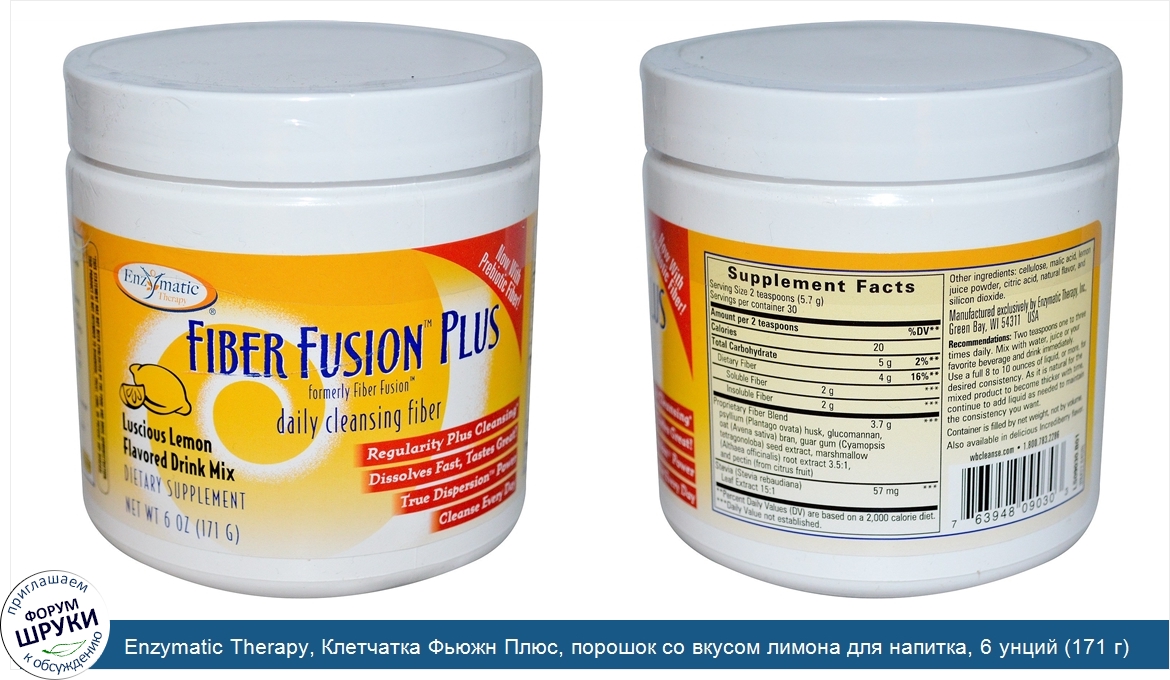 Друзья, если у вас есть отзыв/дополнение/комментарий/вопрос относительно Enzymatic Therapy, Клетчатка Фьюжн Плюс, порошок со вкусом лимона для напитка, 6 унций (171 г) - напишите его ответом в эту тему (это будет полезно всему сообществу в целом и вам в отдельности).