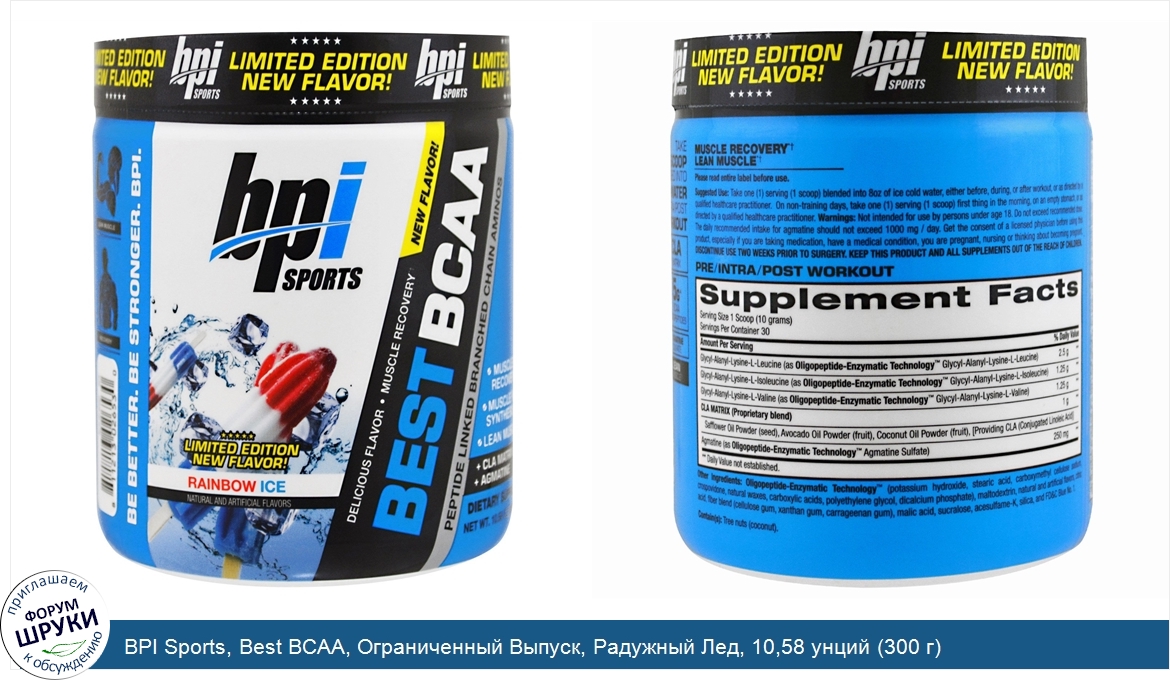 Друзья, если у вас есть отзыв/дополнение/комментарий/вопрос относительно BPI Sports, Best BCAA, Ограниченный Выпуск, Радужный Лед, 10,58 унций (300 г) - напишите его ответом в эту тему (это будет полезно всему сообществу в целом и вам в отдельности).