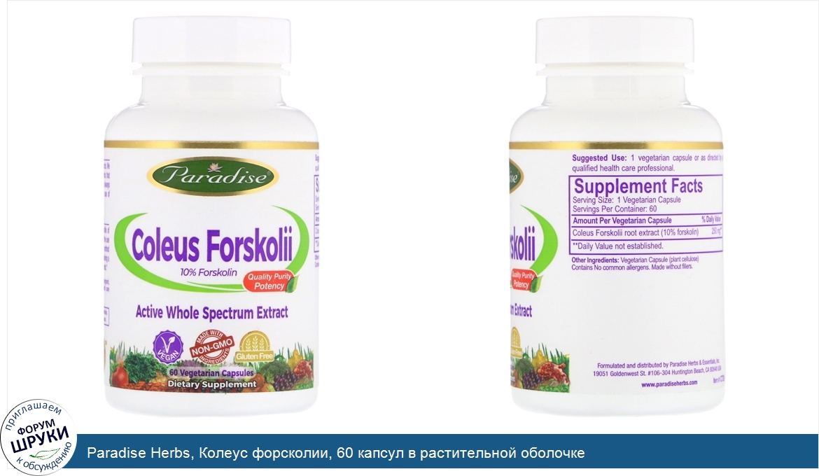Quality, Purity, Potency. 10% Forskolin. Active Whole Spectrum Extract. Dietary Supplement. Enhancing Nature's Miracles Since 1994. Vegan. Made with Non GMO Ingredients. Gluten Free. Paradise products have won 9 ...