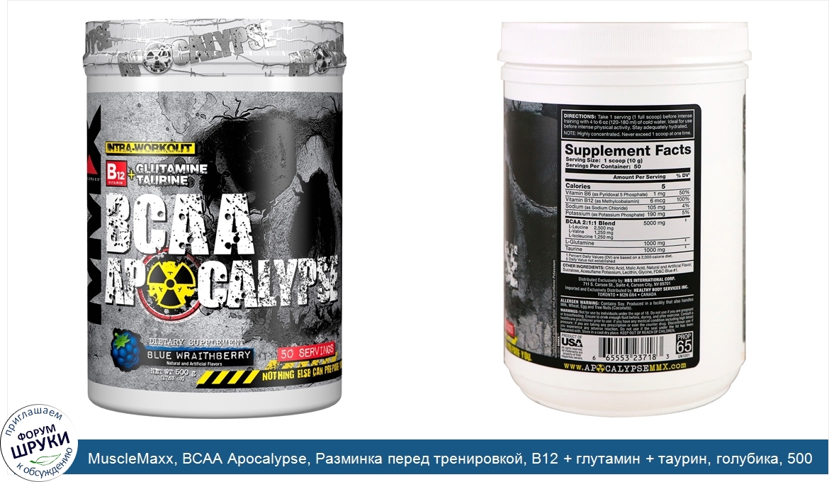 MuscleMaxx, BCAA Apocalypse, Разминка перед тренировкой, B12 + глутамин + таурин, голубика, 500 г (17,63 унции)