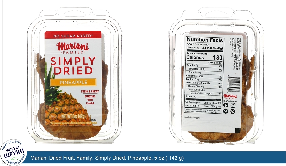 Друзья, если у вас есть отзыв/дополнение/комментарий/вопрос относительно Mariani Dried Fruit, Family, Simply Dried, Pineapple, 5 oz ( 142 g) - напишите его ответом в эту тему (это будет полезно всему сообществу в целом и вам в отдельности).