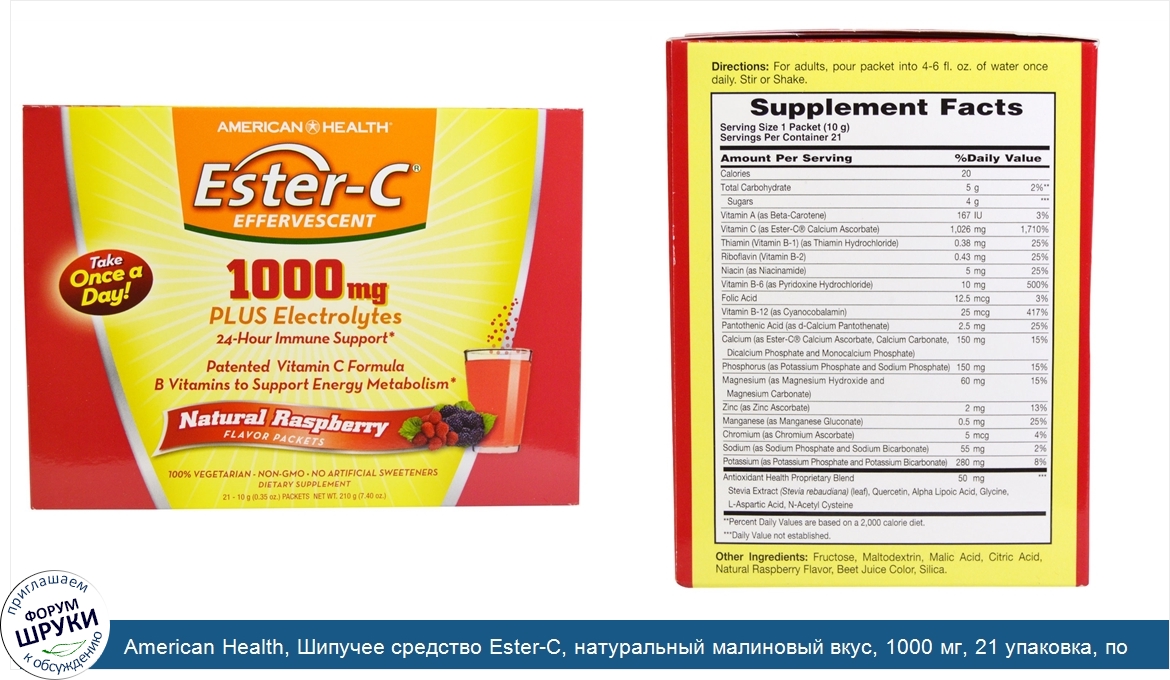 Друзья, если у вас есть отзыв/дополнение/комментарий/вопрос относительно American Health, Шипучее средство Ester-C, натуральный малиновый вкус, 1000 мг, 21 упаковка, по 0,35 унции (10 г) каждая - напишите его ответом в эту тему (это будет полезно всему сообществу в целом и вам в отдельности).