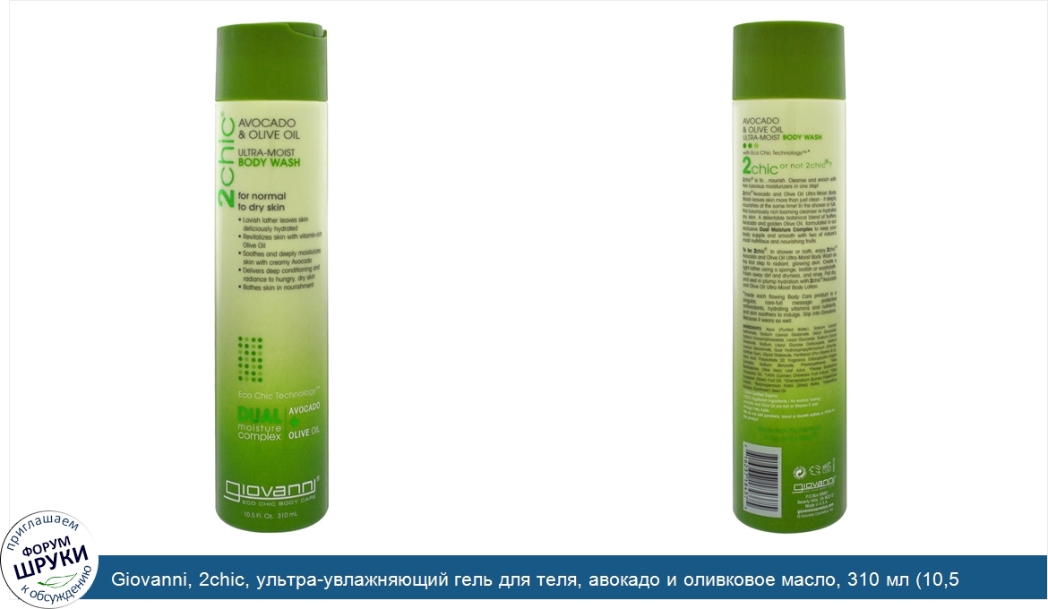 [DESCRIPT]Dual Moisture Complex - Avocado + Olive Oil. Eco Chic Body Care. 100% Vegetarian / No Animal Testing. Beauty from the Elements is Chic on the Street. For Normal to Dry Skin. Lavish lather leaves skin deliciously hydrated. Revitalizes skin with vitamin-rich Olive Oil. Soothes and deeply moisturizes skin with creamy Avocado. Delivers deep conditioning and radiance to hungry, dry skin. Bathes skin in nourishment. 2chic or not 2chic? 2chic is to.nourish. Cleanse and enrich with two luscious moisturizers in one step! 2chic Avocado and Olive Oil Ultra-Moist Body Wash leaves skin more than just clean - it deeply nourishes at the same time! In the shower or tub, this luxuriously rich foaming cleanser re-hydrates dry skin. A delectable botanical blend of buttery Avocado and golden Olive Oil, formulated in our exclusive Dual Moisture Complex to keep your body supple and smooth with two of nature's most nutritious and nourishing fruits. *Inside each flowing Body Care product is a singular, care-full message: protective antioxidants, hydrating vitamins and nutrients, and skin soothers to indulge. Slip into Giovanni. Because it wears so well.[/DESCRIPT]... (описание дополняется)
