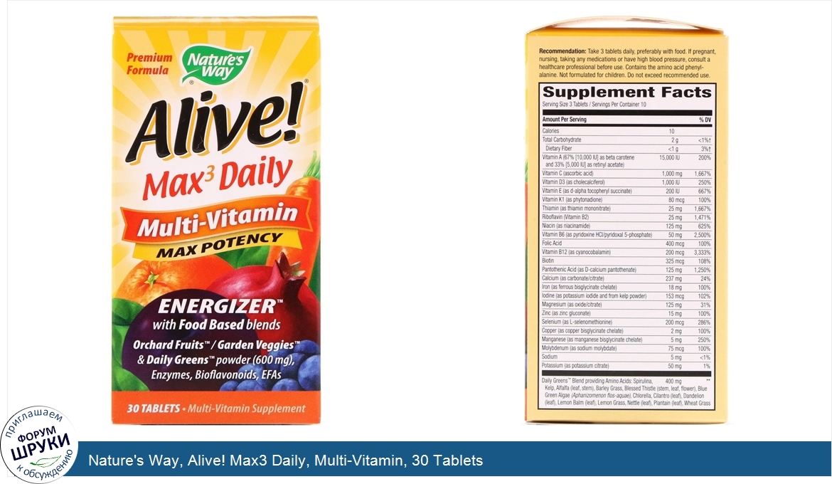 Друзья, если у вас есть отзыв/дополнение/комментарий/вопрос относительно Nature's Way, Alive! Max3 Daily, Multi-Vitamin, 30 Tablets - напишите его ответом в эту тему (это будет полезно всему сообществу в целом и вам в отдельности).