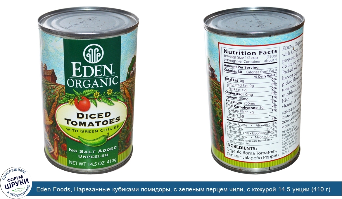 Друзья, если у вас есть отзыв/дополнение/комментарий/вопрос относительно Eden Foods, Нарезанные кубиками помидоры, с зеленым перцем чили, с кожурой 14.5 унции (410 г) - напишите его ответом в эту тему (это будет полезно всему сообществу в целом и вам в отдельности).