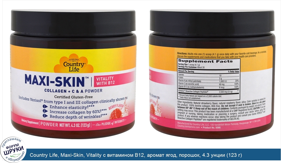 Друзья, если у вас есть отзыв/дополнение/комментарий/вопрос относительно Country Life, Maxi-Skin, Vitality с витамином B12, аромат ягод, порошок, 4.3 унции (123 г) - напишите его ответом в эту тему (это будет полезно всему сообществу в целом и вам в отдельности).