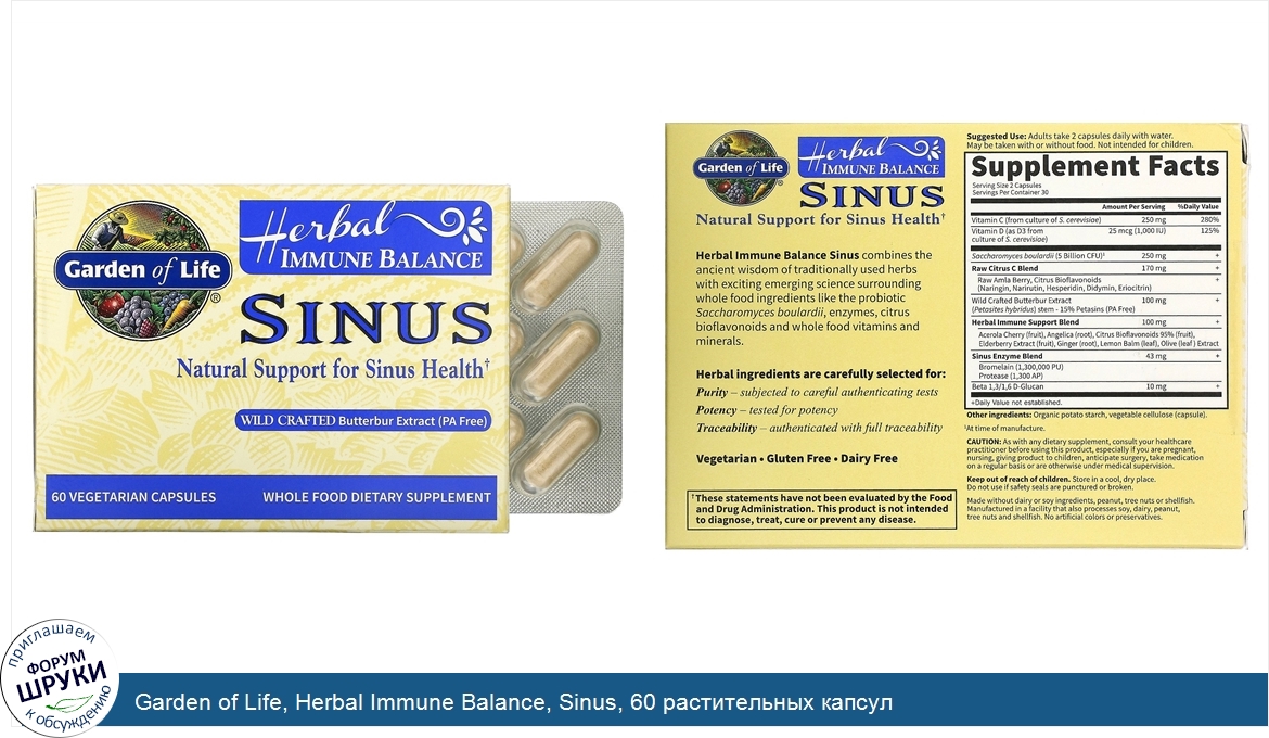 Друзья, если у вас есть отзыв/дополнение/комментарий/вопрос относительно Garden of Life, Herbal Immune Balance, Sinus, 60 растительных капсул - напишите его ответом в эту тему (это будет полезно всему сообществу в целом и вам в отдельности).