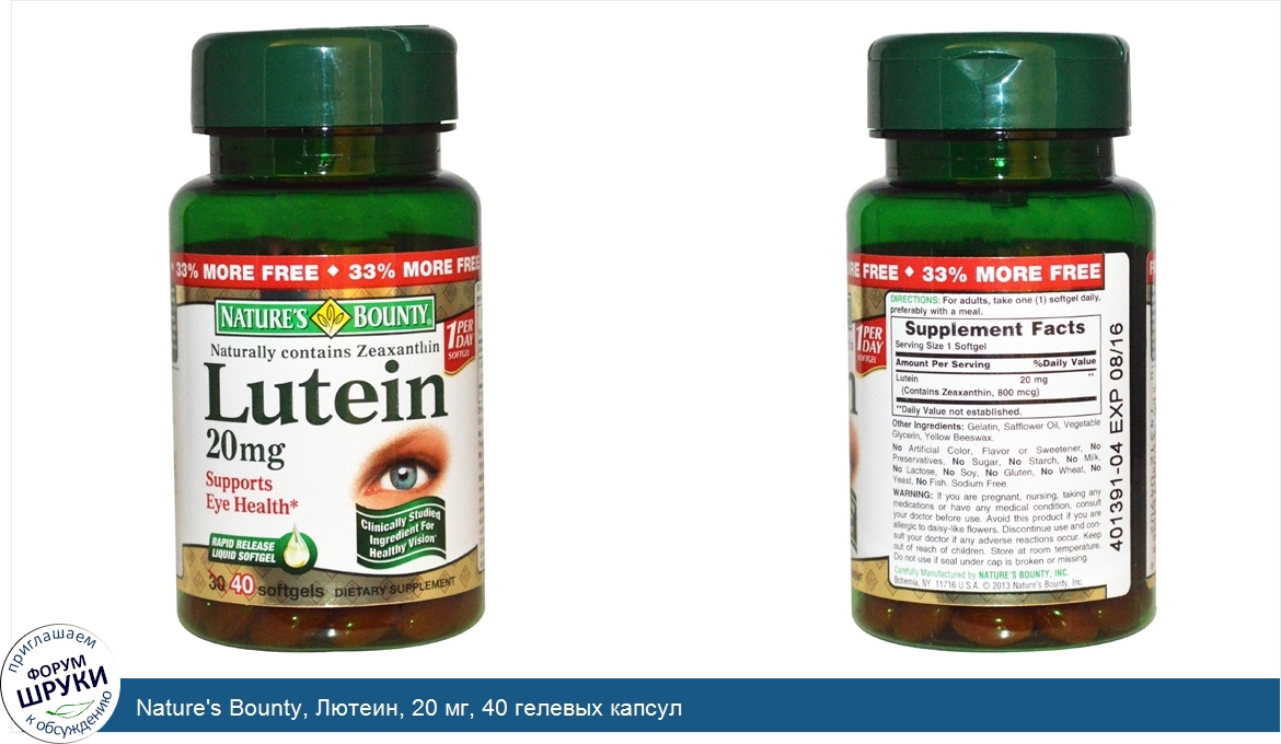 Друзья, если у вас есть отзыв/дополнение/комментарий/вопрос относительно Nature's Bounty, Лютеин, 20 мг, 40 гелевых капсул - напишите его ответом в эту тему (это будет полезно всему сообществу в целом и вам в отдельности).
