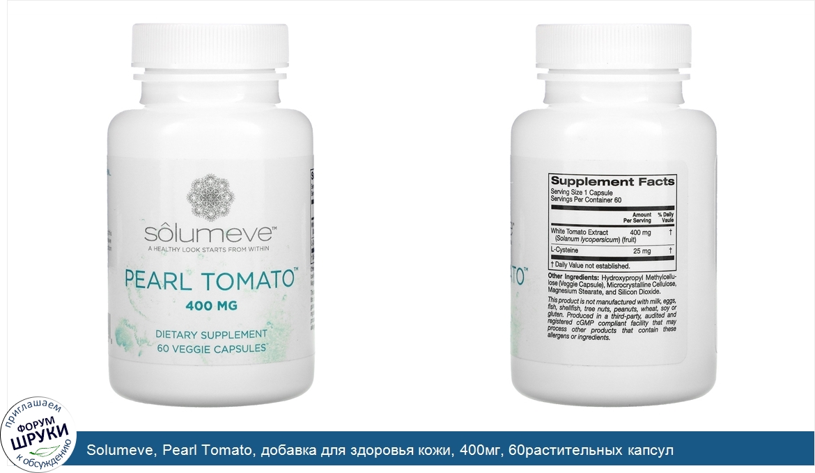 Solumeve, Pearl Tomato, добавка для здоровья кожи, 400мг, 60растительных капсул