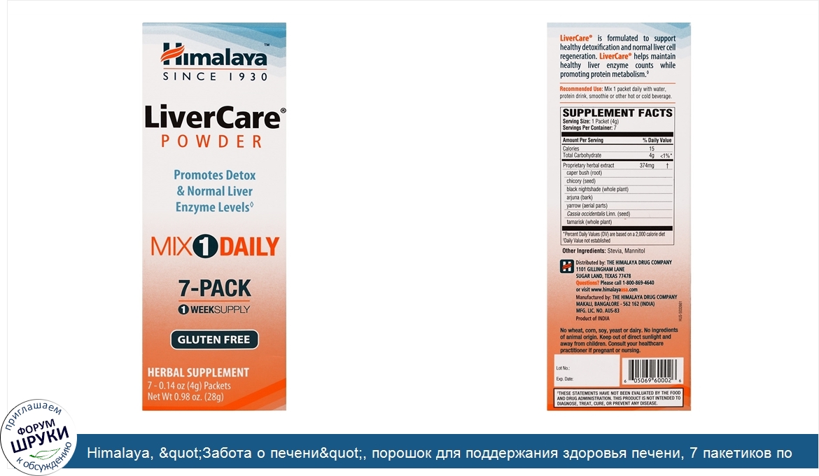 [DESCRIPT]Since 1930. Promotes Detox Normal Enzymes Levels. Mix 1 Daily. 7 Pack- 1 Week Supply. Gluten Free. Herbal Supplement. Happiness Trough Wellness. Family Owned Since 1930. R D Team of Over 200 Physicians, Herbalists and Scientists. Over 1,200 Published Human Clinical Trial on Himalaya Products. Products Sold Worldwide in Over 90 Countries. Sustainable Farming Practices. LiverCare is formulated to support health detoxification and normal liver cell regeneration. LiverCare helps maintain healthy liver enzyme counts while promoting protein metabolism.[/DESCRIPT]... (описание дополняется)