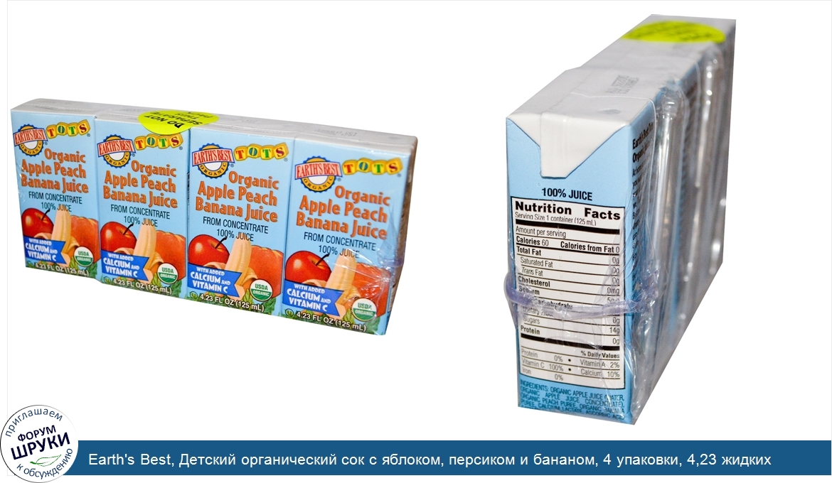 Друзья, если у вас есть отзыв/дополнение/комментарий/вопрос относительно Earth's Best, Детский органический сок с яблоком, персиком и бананом, 4 упаковки, 4,23 жидких унций (125 мл) каждая - напишите его ответом в эту тему (это будет полезно всему сообществу в целом и вам в отдельности).
